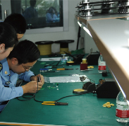 | 駐廠軍代表動手操作體驗電裝工作 | 成飛總裝廠激戰正酣保質量 | 員工正在交流質量問題 |